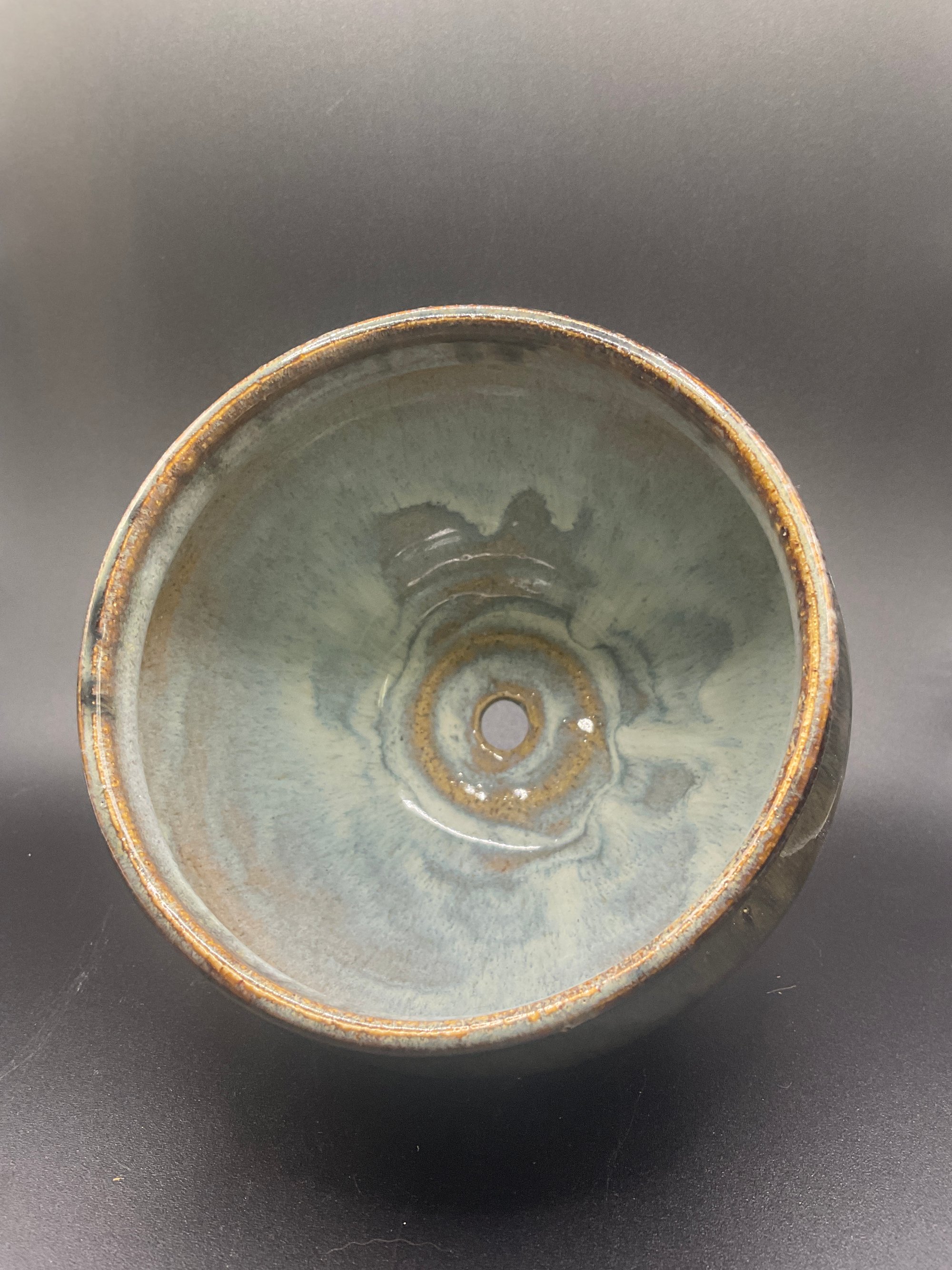 Hard to make a decent picture. Very glossy -almost mirror like closer to the bottom of the pot. Darker blues can be seen thru the mirror.